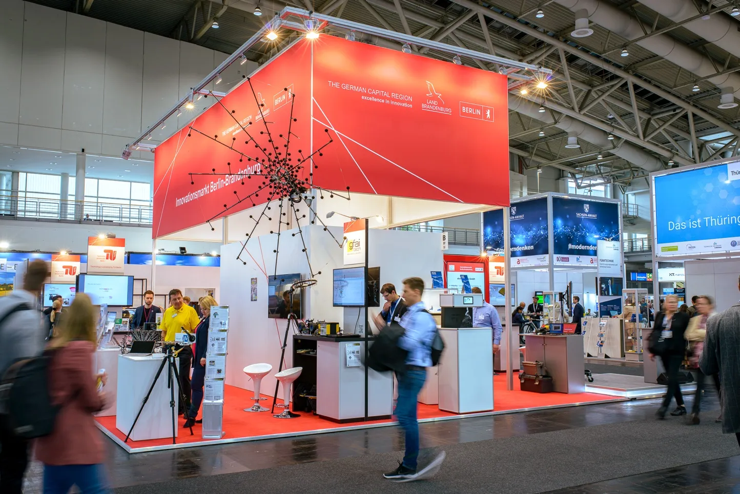 Seit mehr als 20 Jahren begleiten wir wissenschaftliche Einrichtungen, Hochschulen und Startups beim Vermarkten Ihrer Ideen auf Fachmessen. Jedes Jahr beteiligen wir uns an etwa 14 Messen weltweit. Mit dabei sind bis zu 60 Ausstellende aus den Instituten und Fachgebieten der TU Berlin sowie Startups des Centre for Entrepreneurship. Hinzu kommen größere Gemeinschaftsstände für die Länder Berlin und Brandenburg – zum Beispiel auf der HANNOVER MESSE oder der IFA in Berlin.